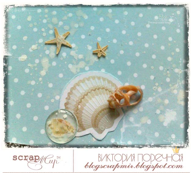 Коробочку-фоторамку. Конечно я использовала нашу коллекцию бумаги "Море") Коробочку делала сама. Добавила морских ракушек и камешков, которые ждали этого часа 2 года. Настоящие морские водоросли и кусочек слюды из самого Казантипа. И конечно ОЭ - свиток, который я старательно состаривала и даже жгла!)