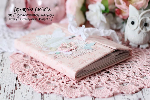 Ну а теперь к деталям на фото. Обложка у миника мягкая, украшена высечками, вырубкой, эпоксидными наклейками, пуговками и моим вязаным цветочком.