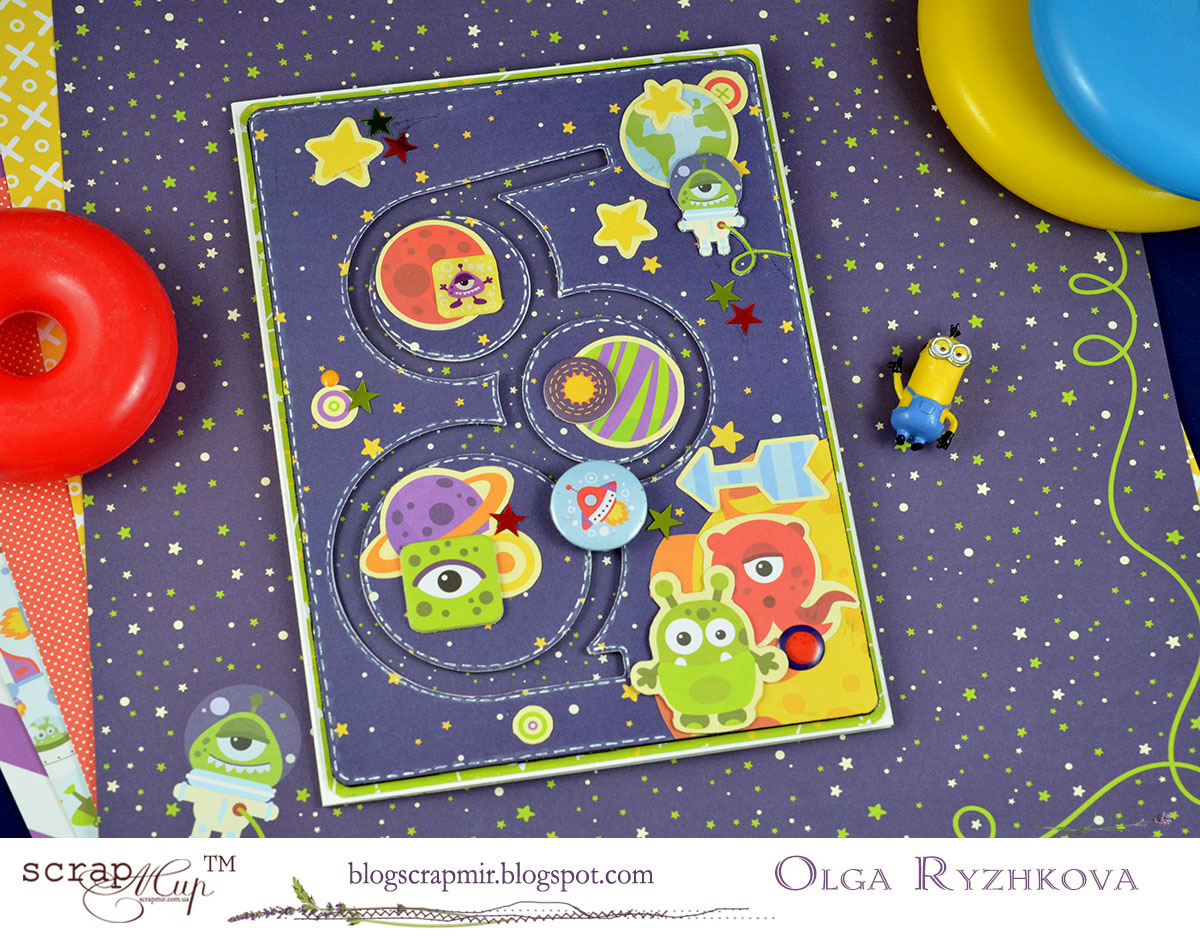 И, конечно же, сделала я эту открытку из нашей космической коллекции Ticket to the Moon. Ведь имея под рукой такую коллекцию, творить очень легко - принты на бумаге соответствуют теме, а маленькие монстрики-высечки - само очарование!