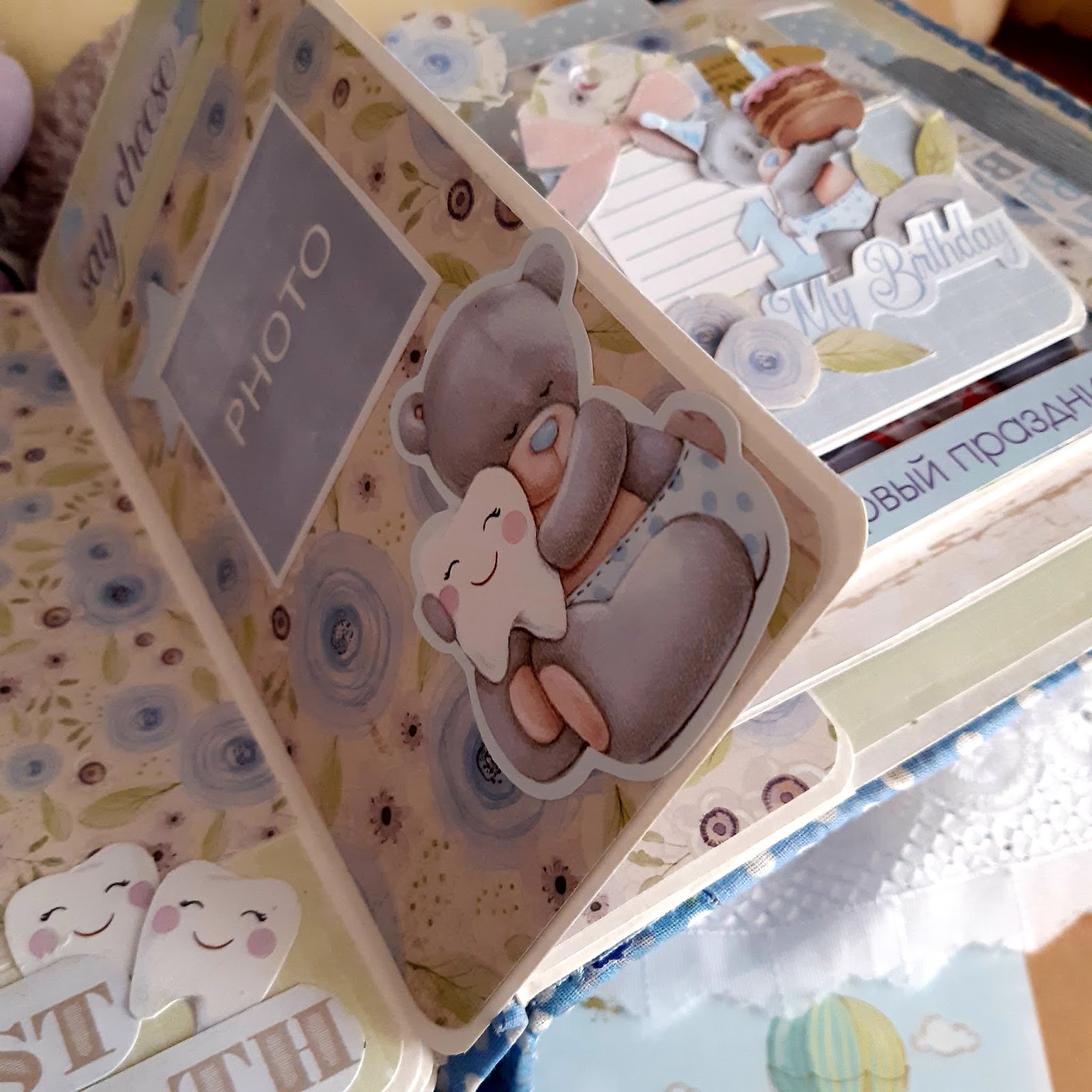 Обложка альбома задекорирована рамочкой шейкером, по желанию можно вместо надписи добавить фотографию малыша.