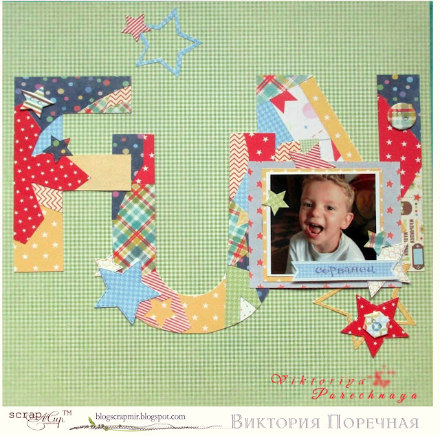 Ни одна страничка не обходится без заголовка и зачастую именно он становится не только центральным элементом работы, но и ее основой, как в этой яркой страничке. К слову, МК этой озорной работы вы найдете тут.
