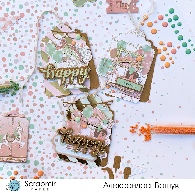 Я использовала листочки с фольгированием и декорировала их остатками от коллекции Happy Days. Она, как нельзя лучше, подходит для рассказа о счастливом детстве.