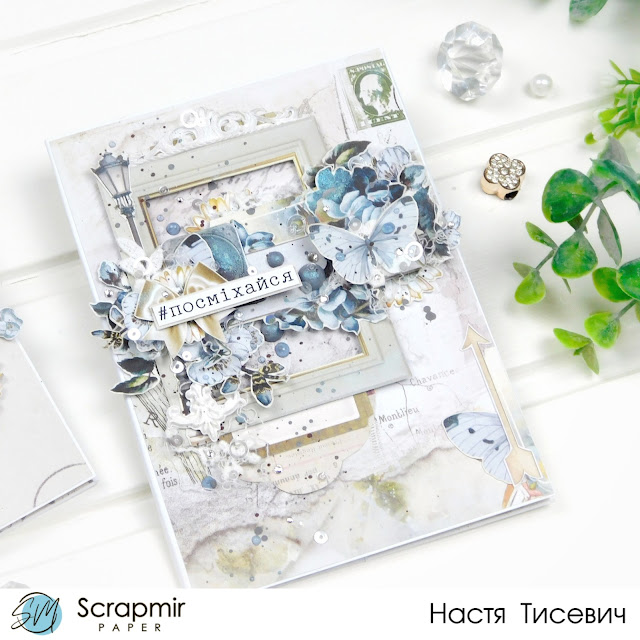 Для нового задания я приготовила объёмную открытку с цветами и веточками. Для этой работы я выбрала коллекцию бумаги "Blue and blush". Она идеально передаёт настроение, которое можно назвать "в предвкушении весны". Открытка сделана из картона и обклеена листами из коллекции.